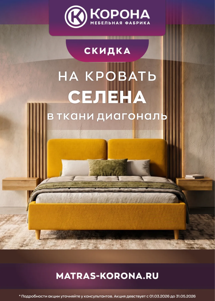 Фирменные магазины фабрики «Корона» запускают специальное предложение на одну из самых гармоничных моделей — интерьерную кровать «Селена». Успейте приобрести эксклюзивную модель в ткани «Диагональ» со скидкой!